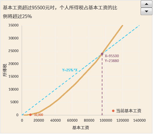 和(hé)前面個(gè)稅占基本工(gōng)資的(de)比例圖表所展示的(de)一樣,當基本工(gōng)資超過95500元時,個(gè)稅(也(yě)稱作所得稅)的(de)曲線出現了一個(gè)拐點,出現了一個(gè)表示所得稅上(shàng)升速率超過其它指标的(de)拐點。